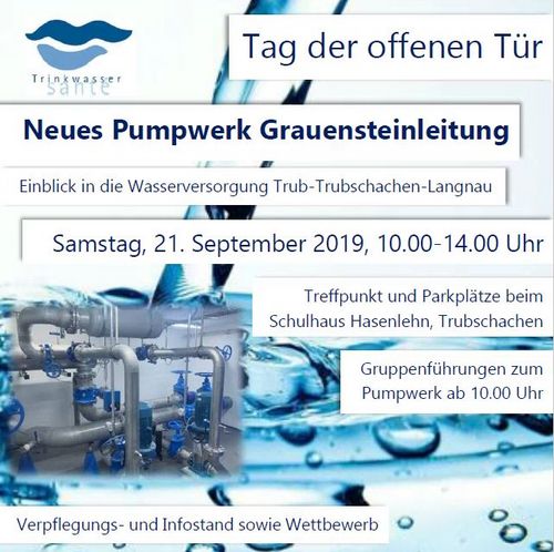 Am Samstag, 21. September 2019 findet der Tag der offenen Tür des neuen Pumpwerks Grauensteinleitung statt. Es werden Gruppenführungen ab 10.00 Uhr zum Pumpwerk organisiert. Der Treffpunkt und die Parkplätze befinden sich beim Schulhaus Hasenlehn. Damit niemand hungrig und durstig nach Hause gehen muss, bieten wir Ihnen ein kleines Speise- und Getränkeangebot an. Wer an unserem Wettbewerb teilnimmt, kann tolle Preise gewinnen.